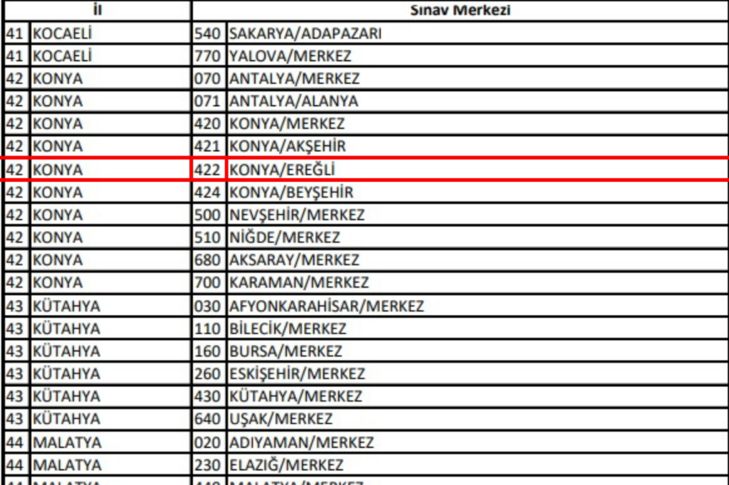 KPSS Genel Yetenek, KPSS Genel Kütür ve Eğitim Bilimleri sınav merkezi ve kodları bölümünde 422 kodu ile sınava girecek olan öğrenciler Ereğli’yi tercih edebilecekler.