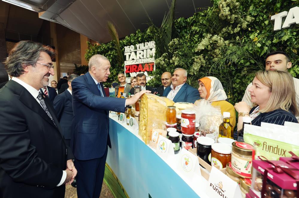 1863 yılından beri Ziraat Bankası’nın Türk tarımının lokomotifi olduğunu söyleyen Cumhurbaşkanı Erdoğan, “Savaş dönemleri dahil ülkemizin yokluk günlerinde bankamız çiftçinin, esnafın, tüccarın, girişimcinin yanında yer aldı. Üreticilerimizin insanımızın iliğini sömüren tefecilerin ve faiz lobilerinin pençesine düşmemesi noktasında hayati rol üstlendi. Ziraat Bankası dün olduğu gibi bugün de ülkeyi ve milleti önceleyen duruşunu muhafaza ediyor. Şunu bir kez daha hatırlatmak isterim, Ziraat Bankası sadece kar peşinde koşan bir banka değildir. Bunun yanı sıra Ziraat, ihtiyaç duydukları anda çiftçinin, esnafın, sanayici, tüccar ve ihracatçının elinden tutan bir kara gün dostudur. Her iktisadi teşekkül çalışmalarını sürdürmeyi, yeni yatırımlarla faaliyet sahasını büyütmeyi ve genişletmeyi hedefler. Ziraat Bankamızın da hem ülke içinde hem de yurt dışında mevcudiyetini artırdığını görmekten artık memnuniyet duyuyorum. 2015 yılında Ziraat Katılım’ın faaliyete geçmesiyle birlikte bankamız hızla gelişen alternatif finans piyasasında da yerini almıştır. Biraz evvel genç ve kadın çiftçilerimiz ile kooperatif ürünlerinin yer aldığı stant alanını ziyaret ettik. Ülkemiz tarımının çeşitliliğine ve zenginliğine burada tekrar şahit olduk. Bu hazineyi ne kadar ileriye taşırsak Türkiye için o kadar iyi olacaktır. Tabii bunun için tarım sektörünün tüm paydaşlarının el ele vermesi, iş birliği ve dayanışması içinde hareket etmesi mühimdir. Tarım sektörünün bütün aktörlerini aynı zamanda buluşturan bu tarz programlar anlayış birliğinin tesisini de kolaylaştırmaktadır” dedi.