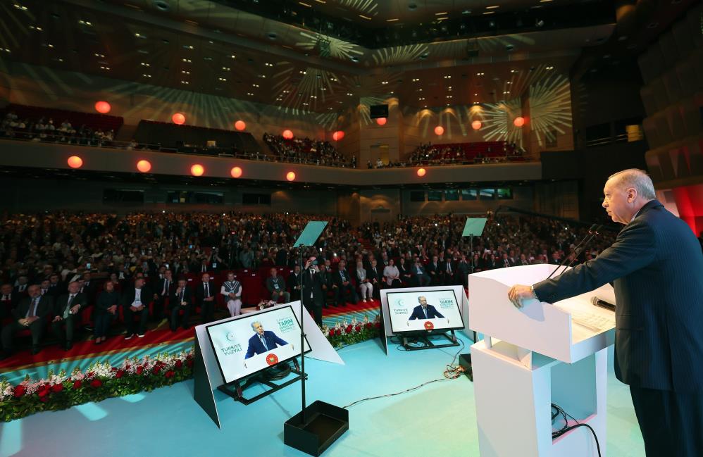 Tarımı sadece ekonomi için değil milletin bekası için de hayati önemde bir sektör olarak gördüklerini ifade eden Cumhurbaşkanı Erdoğan, “Türkiye Yüzyılı’nın temel unsurları arasında tarım, hayvancılık, kırsal kalkınma ve tüm bu alanlarda verimlilik artışının ayrı bir yeri var. Son 21 yılda bunun alt yapısını güçlendirme yolunda önemli adımlar attık. Tarım desteklerini hem çeşitlendirdik hem de ciddi oranda yükselttik. Tarım Kredi Kooperatiflerimiz sektörün ve çiftçini daima yanında oldu. Çiftçilerimizin finansman ihtiyacını karşılamak üzere Ziraat Bankalarımızın kullandırdığı tarım kredilerinin tutarı 480 milyar lirayı aşmış durumdadır. Bu kredilerden yararlanan çiftçilerimiz sayısı 1,2 milyonu aştı. Bizim gayemiz insanları doğdukları yerde doyar hale getirmektir. Tarımın ana vatanı olan Anadolu’da yeşil kalkınma ve yerelden kalkınma ilkesiyle yeni bir tarım ve kırsal kalkınma süreci başlatıyoruz. Kırsal kalkınma hibe programlarımızı üretim planlamasını dikkate alarak yeniden düzenledik. 2024 yılı kırsal kalkınma yatırımlarının desteklenmesi programı hibe desteğine esas proje limitini 7 milyon liradan 14 milyon liraya yükselttik. 5 milyar lira hibe desteği sağlayacağımız 7 bin projeyi ve hak sahiplerini bugünden itibaren Tarım ve Orman Bakanlığımız açıklamaya başlayacak. Bu projelerle toplam 13 milyar lira yatırım yapılacak olup yaklaşık 20 bin vatandaşımıza istihdam sağlayacağız. Ziraat Bankası ve Tarım Kredi Kooperatifleri çiftçilerimiz için ilk kez hayata geçen yeni tarımsal kredi uygulamalarını aybaşında kamuoyu ile paylaştı. Üretim planlaması kapsamında üretim ve sözleşmeli üretim yapan çiftçilerimiz ilk defa ilave faiz kar payı indiriminden faydalanabilecek. Organize tarım bölgesi yatırımı yapacak üreticilerimize ve birinci derecede tarımsal amaçlı örgütlerimize de ilk defa ilave faiz indirimi uygulanacak” diye konuştu.