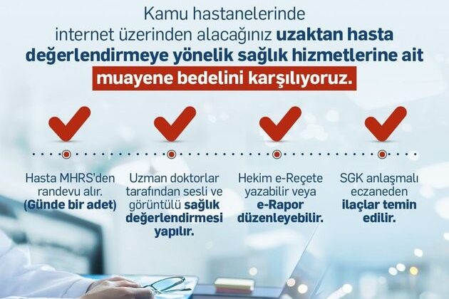 Kamu hastanelerinde internet üzerinden alınacak uzaktan hasta değerlendirmeye yönelik sağlık hizmetlerine ait muayene bedeli artık Sosyal Güvenlik Kurumu tarafından karşılanacak. Çalışma ve Sosyal Hizmetler Bakanı Vedat Işıkhan, sosyal medya hesabından yaptığı açıklamada, Sosyal Güvenlik Kurumu olarak sağlık hizmetlerinde dönüşümü desteklediklerini belirterek, “Sağlık Uygulama Tebliği (SUT) değişikliği ile uzman hekimler tarafından uzaktan hasta değerlendirmeye yönelik sağlık hizmetlerini geri ödeme listesine alıyoruz. Tebliğ bugün itibarıyla yürürlüğe girdi. Böylelikle hastalarımızın Sağlık Bakanlığı’na bağlı ikinci ve üçüncü basamak kamu hastanelerinde muayene, tetkik sonuçlarının değerlendirilmesi, e-reçete ve e-rapor gibi hizmetlerin bedellerini Sosyal Güvenlik Kurumumuz tarafından karşılıyoruz” ifadelerine yer verdi.