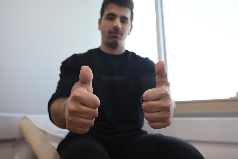 Parmaklarına 350 tonluk pres düşerek iki el baş parmağını kaybeden Enes Çelik, “Geçtiğimiz Eylül ayında iş kazası geçirdim. Her iki elimin başparmağına 350 tonluk pres düştü. Dibinden kopmuştu, umudum yoktu. İlk ameliyattan sonra bu operasyonu söylediler. Ben de kabul ederek nakil oldum. Olmaz diye düşünürken eskisi gibi her şeyi kendim yapabiliyorum. Bir ağrım falan yok, ağırlık kaldırabiliyorum, yazı yazabiliyorum. Şuan her şey kontrol altında. Her şeye rağmen umudunuzu yitirmeyin. İyi bir hocayla normale dönebilir. Ben memnumum halimden, bu kadar toplanacağını tahmin etmiyordum. Ben daha kötüsünü bekliyordum açıkçası ama şuan her istediğimi yapabiliyorum” dedi.