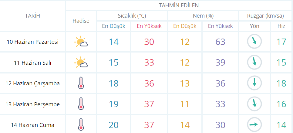 Haziran ayının gelmesiyle birlikte hava sıcaklıklarında yaşanan artış etkisini sürdürüyor. Bu hafta boyunca etkisini gösterecek olan sıcaklıklarda hava derecesinin 37 derecelere kadar çıkması bekleniyor. Gece en düşük sıcaklık değerleri ise 20 dereceye kadar yükselecek.