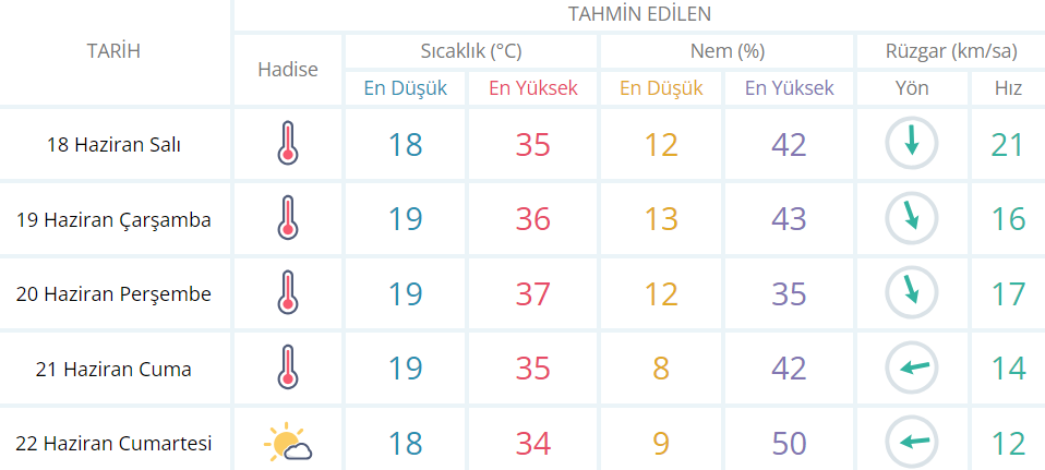 Haziran ayıyla birlikte hava sıcaklıklarında yaşanan artış etkisini sürdürmeye devam ediyor. Bu hafta boyunca etkisini gösterecek olan sıcaklıklarda hava derecesinin 37 derecelere kadar çıkması bekleniyor. Gece en düşük sıcaklık değerleri ise 19 derece olacak.