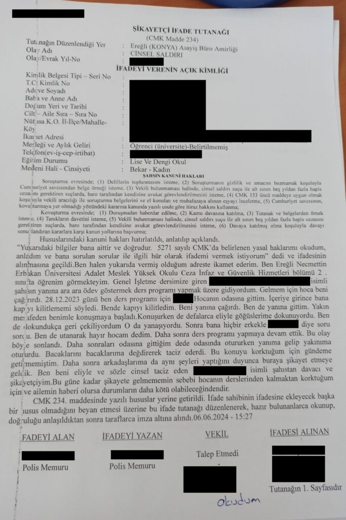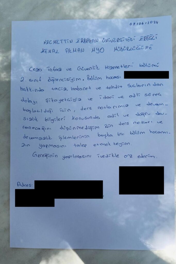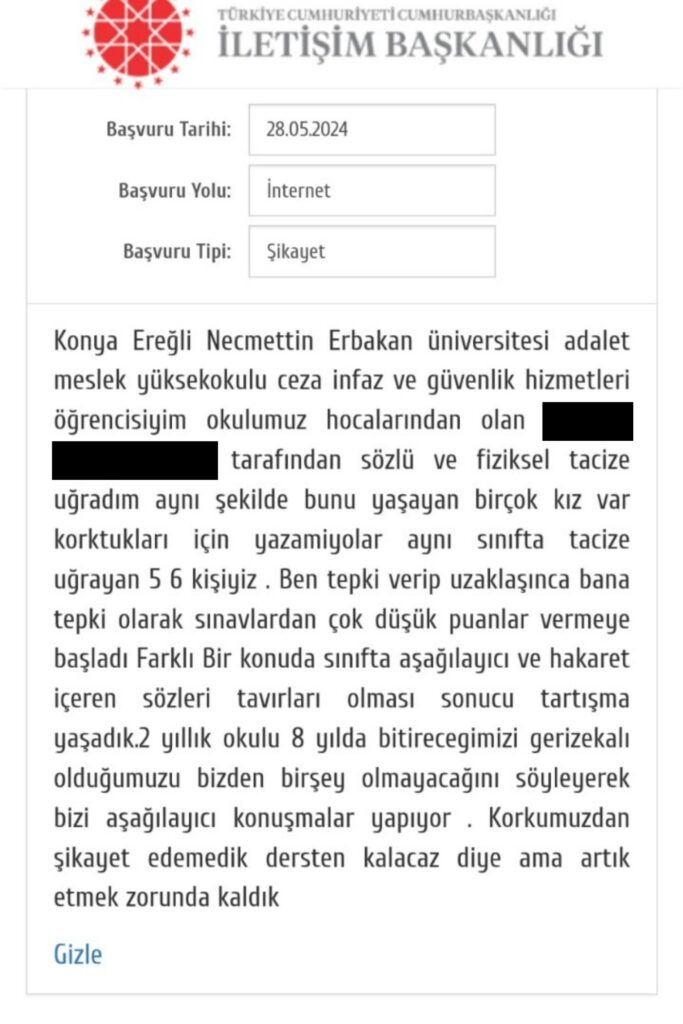 Yaşanan tüm bu süreçlerin ardından birbirinden habersiz olan ve tacize uğradığını iddia eden öğrencilerden biri ilk şikayeti Cumhurbaşkanlığı İletişim Merkezi’ne (CİMER) ilettiğini de kaydetti. Öğrenci CİMER’e ilettiği şikayette şunları yazdığını belirtti: “Konya Ereğli Necmettin Erbakan Üniversitesi Adalet Meslek Yüksekokulu Ceza İnfaz ve Güvenlik Hizmetleri öğrencisiyim. Okulumuz hocalarından olan E. D. tarafından sözlü ve fiziksel tacize uğradım. Aynı şekilde bunu yaşayan birçok kız var. Korktukları için yazamıyorlar. Aynı sınıfta tacize uğrayan 5-6 kişiyiz. Ben tepki verip uzaklaşınca bana tepki olarak sınavlardan çok düşük puanlar vermeye başladı. Farklı bir konuda sınıfta aşağılayıcı ve hakaret içeren sözleri tavırları olması sonucu tartışma yaşadık. 2 yıllık okulu 8 yılda bitireceğimizi, gerizekalı olduğumuzu, bizden birşey olmayacağını söyleyerek bizi aşağılayıcı konuşmalar yapıyor. Korkumuzdan şikayet edemedik dersten kalacağız diye ama artık etmek zorunda kaldık.”