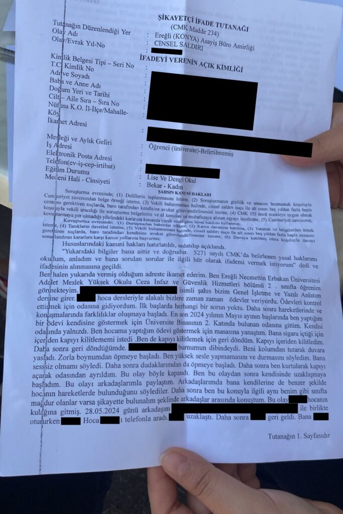 Tacize uğradığı iddia eden ve Akademisyen E. D’nin odasında zorla öpülmeye çalışıldığını kaydeden başka bir öğrenci ise şunları kaydetti: “Tarihini tam hatırlamamakla birlikte 2024 yılının Nisan ayında Genel İşletme dersimize giren Akademisyen E. D. isimli şahıs bize dersleriyle alakalı ödevler veriyordu. Ödevleri kontrol ettirmek için odasına gidiyordum. Mayıs ayında yine ödevimi göstermek için hocanın ikinci katta bulunan odasına girdim. Ben odasına girince kalkıp kendi kapıyı kilitledi. Ben kendisine ödevimi gösterirken yaklaştım. O anda beni öpmeye çalıştı. Ben de hemen kafamı uzaklaştırdım. Odasından çıkmaya çalışırken bir anda kapıya doğru geldi. Ben hemen kapıdan çıkarken eliyle kalçama dokunarak taciz etti. Ben bu olaydan sonra bir daha yanına gitmedim. Bu hoca okulda diğer arkadaşlarımada aynı şeyleri yapmış. Ben ilk başlarda bu konular için şikayette bulunmayı düşünmüyordum. Daha sonra bu hocanın aynı şeyleri arkadaşlarımada yaptığını öğrendim.”