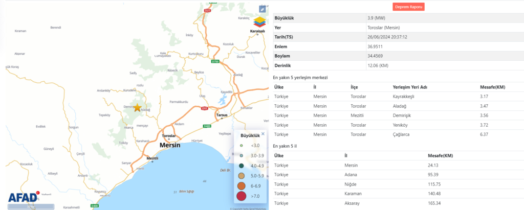 Mersin’de saat 23.37’de 3,9 büyüklüğünde deprem meydana geldi. Afet ve Acil Durum Yönetimi Başkanlığı’ndan (AFAD) yapılan açıklamaya göre deprem, yerin 12.06 kilometre derinliğinde meydana geldi.