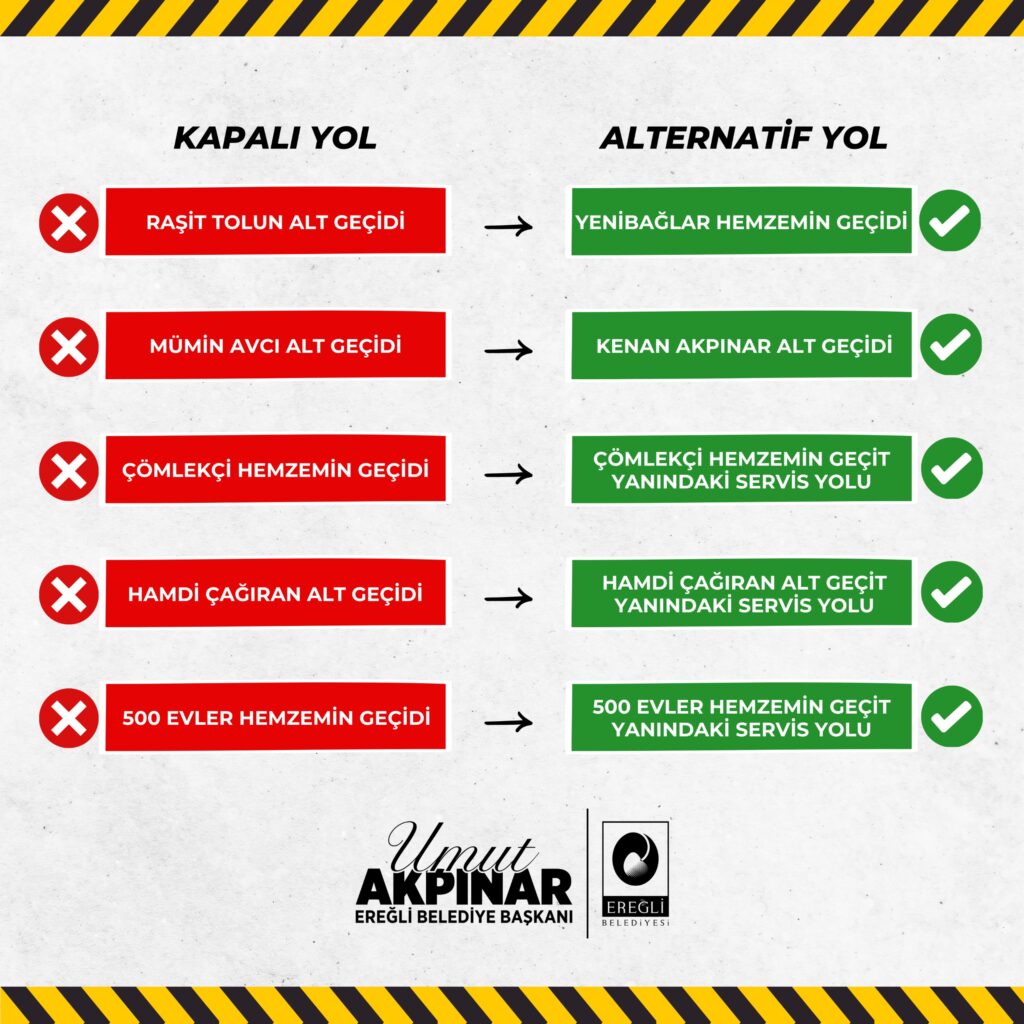 Devlet Demir Yolları İşletme Genel Müdürlüğü Demiryolu Modernizasyon Dairesi Başkanlığı tarafından başlatılan yapım çalışmaları nedeniyle Ereğli’de kapatılan alt geçitlerin alternatif güzergahları paylaşıldı.