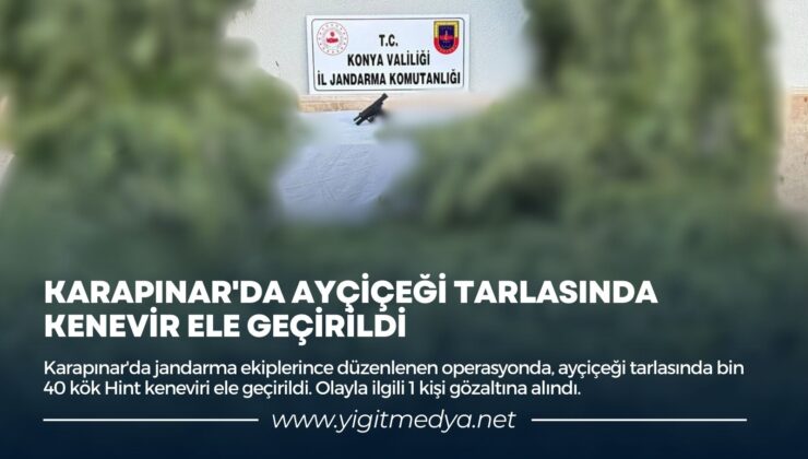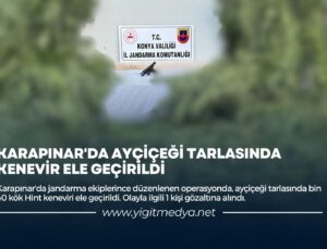 Edinilen bilgiye göre, Konya İl Jandarma Komutanlığı ile Karapınar İlçe Jandarma ekipleri, ilçenin Akçayazı Mahallesi’nde B.İ.’ye ait ayçiçeği ekili tarlasında kenevir ekimi yapıldığını belirledi. Yapılan istihbarat çalışmasında şahsın tarlasında ve evinde yapılan aramada tarlasında ekili vaziyette bin 40 kök kenevir bitkisi ve 1 adet tabanca ele geçirildi. Olayla ilgili tarla sahibi B.İ., gözaltına alındı.