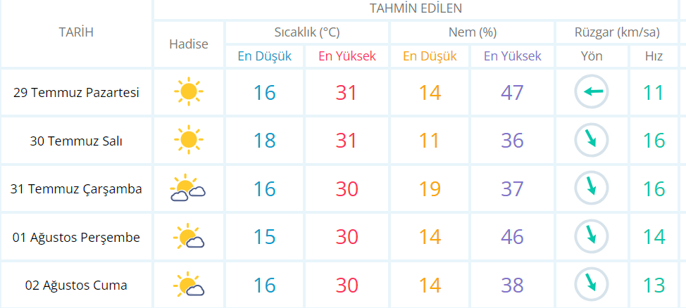Hava sıcaklıklarında yaşanan artış etkisini kaybederek düşüşe geçecek. Bu hafta boyunca sıcaklıklarda hava derecesinin 31 derecelerde olması bekleniyor. Gece en düşük sıcaklık değerleri ise 11 derece olacak.