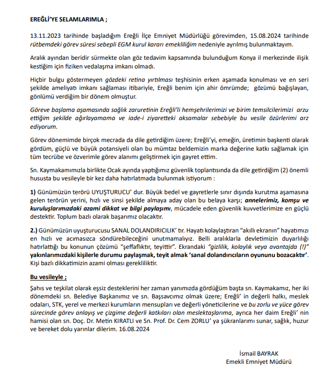Bayrak, yayınladığı veda mesajında Ereğli’ye dair şu ifadelere yer verdi: “13.11.2023 tarihinde başladığım Ereğli İlçe Emniyet Müdürlüğü görevimden, 15.08.2024 tarihinde rütbemdeki görev süresi sebepli EGM kurul kararı emekliliğim nedeniyle ayrılmış bulunmaktayım. Aralık ayından beridir sürmekte olan göz tedavim kapsamında bulunduğum Konya il merkezinde ilişik kestiğim için fiziken vedalaşma imkanı olmadı. Hiçbir bulgu göstermeyen gözdeki retina yırtılması teşhisinin erken aşamada konulması ve en seri şekilde ameliyatı imkanı sağlaması itibariyle, Ereğli benim için ahir ömrümde; gözümü bağışlayan, gönlümü verdiğim bir dönem olmuştur. Göreve başlama aşamasında sağlık zaruretinin Ereğli’li hemşerilerimizi ve birim temsilcilerimizi arzu ettiğim şekilde ağırlayamama ve iade-i ziyaretteki aksamalar sebebiyle bu vesile özürlerimi arz ediyorum. Görev dönemimde birçok mecrada da dile getirdiğim üzere; Ereğli’yi, emeğin, üretimin başkenti olarak gördüm, güçlü ve büyük potansiyeli olan bu mümtaz beldemizin marka değerine katkı sağlamak için tüm tecrübe ve özverimle görev alanımı geliştirmek için gayret ettim.”