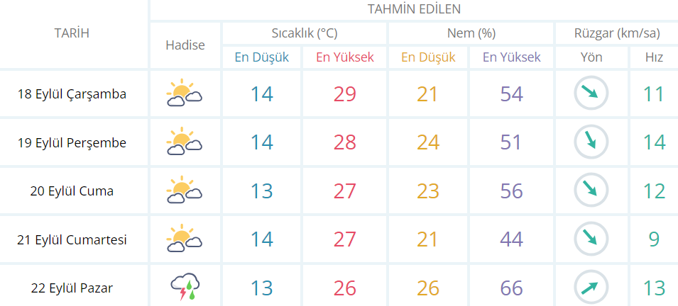 Sıcaklıkların yerini daha serin havalara bırakacağı hafta boyunca derecelerin 26 ile 29 arasında değişmesi bekleniyor. Gece en düşük sıcaklık değerleri ise 13 derece olacak.
