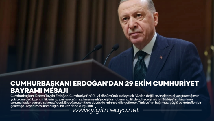 Cumhurbaşkanı Recep Tayyip Erdoğan, Cumhuriyet’in 101. yıl dönümünü kutlayarak, “Acıları değil, sevinçlerimizi yarıştıracağımız, yoklukları değil, zenginliklerimizi paylaşacağımız, karamsarlığı değil umutlarımızı filizlendireceğimiz bir Türkiye’nin kapılarını sonuna kadar açmak istiyoruz” dedi. Erdoğan, şehitlere duyduğu minneti dile getirerek Türkiye’nin bağımsız, güçlü ve müreffeh bir geleceğe ulaştırılması kararlılığını bir kez daha vurguladı.