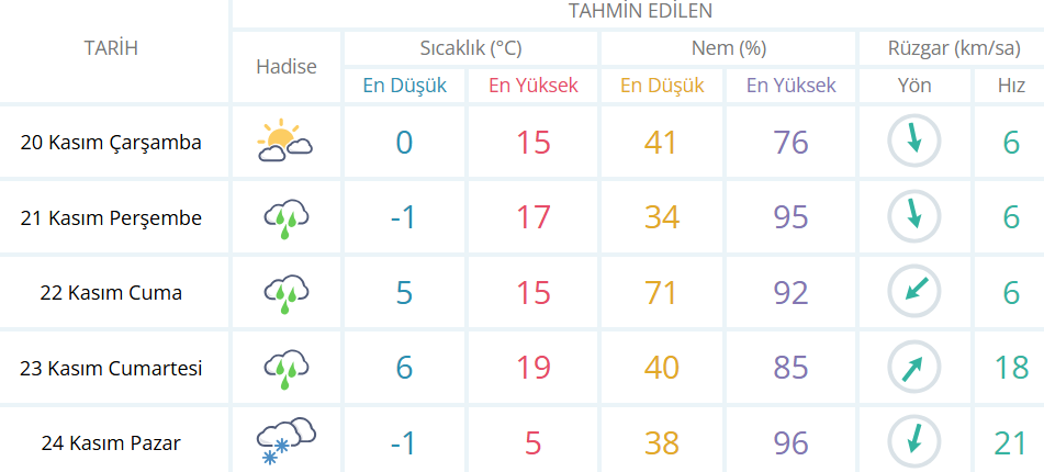 Meteoroloji Genel Müdürlüğü verilerine göre Ereğli’de yağışlı hava, 21 Kasım Perşembe günü başlayacak. Perşembe, Cuma ve Cumartesi günleri boyunca sağanak yağmur etkili olacak. Hafta sonu ise hava sıcaklıklarında ani bir düşüş bekleniyor. 24 Kasım Pazar günü sıcaklığın 5 dereceye kadar inmesiyle birlikte kar yağışı bekleniyor.