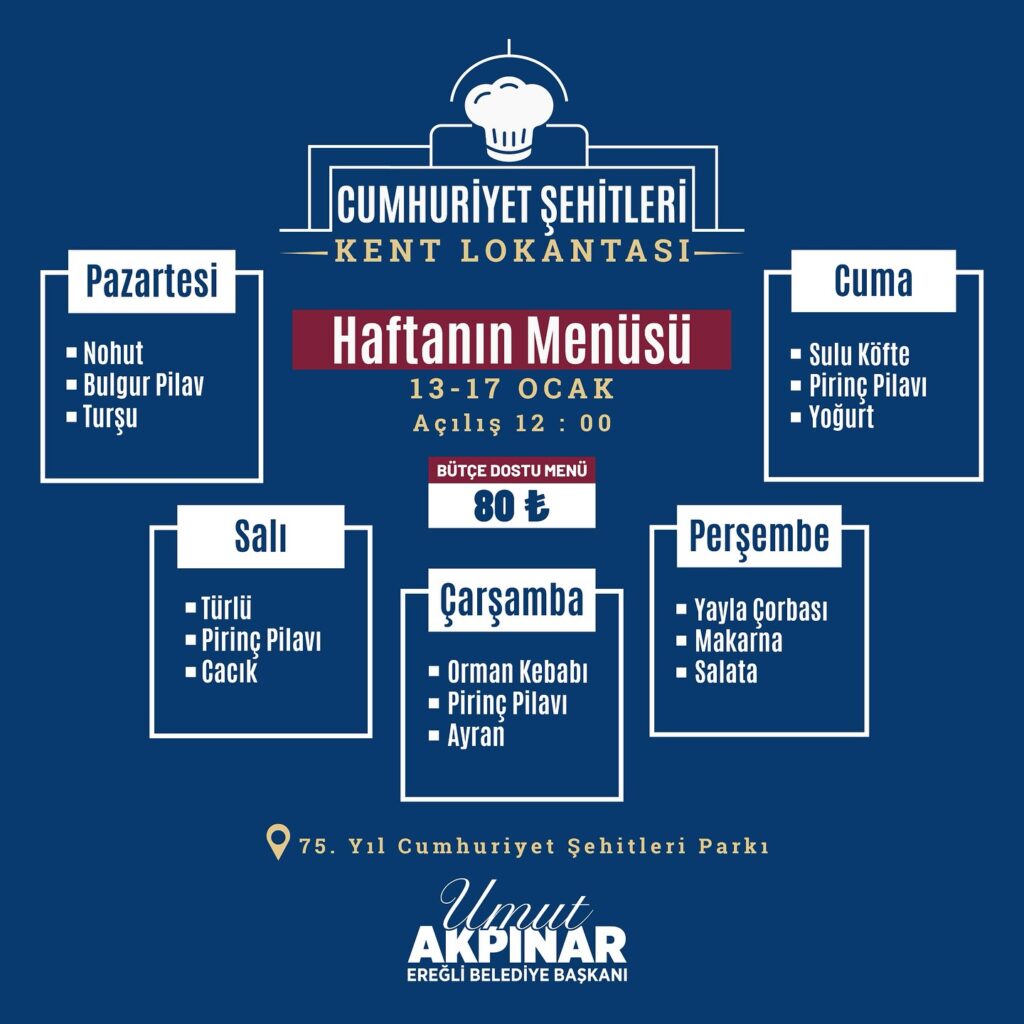Cumhuriyet Şehitleri Kent Lokantasının günlük menüleri Ereğli Belediyesi’nin web sitesinden ve sosyal medya hesaplarından duyuruldu. Günlük üç çeşit yemek içeren bir menü, 80 TL olarak belirlendi.