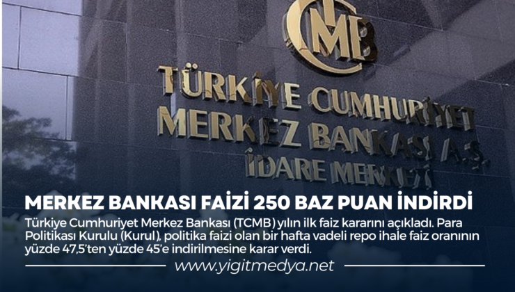 Türkiye Cumhuriyet Merkez Bankası (TCMB) yılın ilk faiz kararını açıkladı. Para Politikası Kurulu (Kurul), politika faizi olan bir hafta vadeli repo ihale faiz oranının yüzde 47,5’ten yüzde 45’e indirilmesine karar verdi.