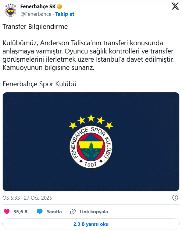 Sarı-lacivertli kulüpten yapılan açıklamada, “Kulübümüz, Anderson Talisca’nın transferi konusunda anlaşmaya varmıştır. Oyuncu sağlık kontrolleri ve transfer görüşmelerini ilerletmek üzere İstanbul’a davet edilmiştir” denildi.