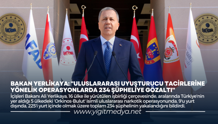 İçişleri Bakanı Ali Yerlikaya, 16 ülke ile yürütülen işbirliği çerçevesinde, aralarında Türkiye’nin yer aldığı 5 ülkedeki ‘Orkinos-Bulut’ isimli uluslararası narkotik operasyonunda, 9’u yurt dışında, 225’i yurt içinde olmak üzere toplam 234 şüphelinin yakalandığını bildirdi.