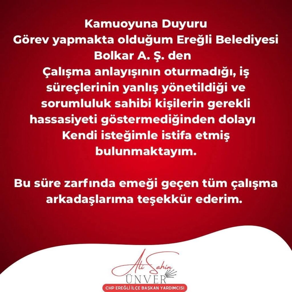 “Görev yapmakta olduğum Ereğli Belediyesi Bolkar A.Ş.’den, çalışma anlayışının oturmadığı, iş süreçlerinin yanlış yönetildiği ve sorumluluk sahibi kişilerin gerekli hassasiyeti göstermediğinden dolayı kendi isteğimle istifa etmiş bulunmaktayım. Bu süre zarfında emeği geçen tüm çalışma arkadaşlarıma teşekkür ederim.”