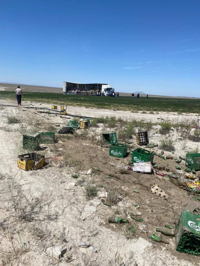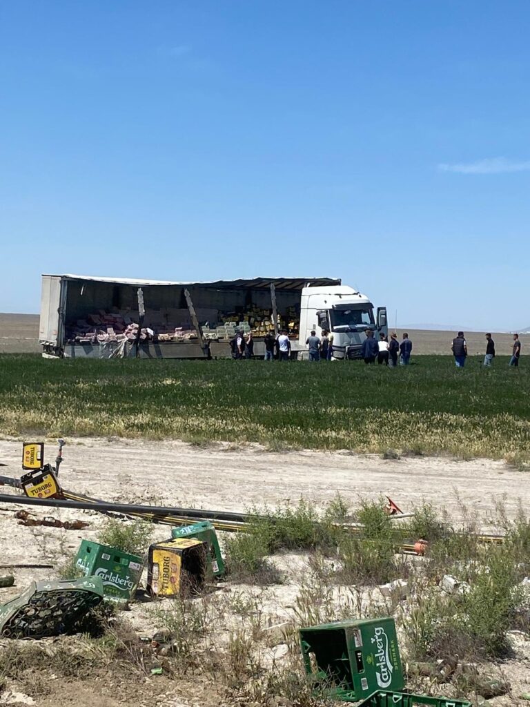 Olay, Organize Sanayi Bölgesinde meydana geldi. Edinilen bilgilere göre, alkollü içecek taşıyan tırın seyir sırasında lastiği patladı. Sürücünün direksiyon hâkimiyetini kaybettiği araç, yol kenarındaki tarım arazisine girerek durabildi. Tır devrilmezken, dorse kapaklarının açılmasıyla birlikte alkol şişeleri etrafa dağıldı.