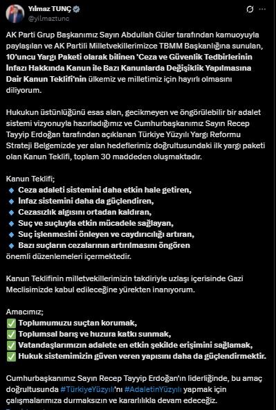 Adalet Bakanı Yılmaz Tunç, AK Parti Grup Başkanı Abdullah Güler tarafından kamuoyuyla paylaşılan ve AK Partili milletvekillerince Türkiye Büyük Millet Meclisi (TBMM) Başkanlığına sunulan “10. Yargı Paketi” olarak bilinen ‘Ceza ve Güvenlik Tedbirlerinin İnfazı Hakkında Kanun ile Bazı Kanunlarda Değişiklik Yapılmasına Dair Kanun Teklifi’nin Türkiye için hayırlı olmasını diledi. Bakan Tunç, sosyal medya hesabından yaptığı paylaşımda şu ifadelere yer verdi: