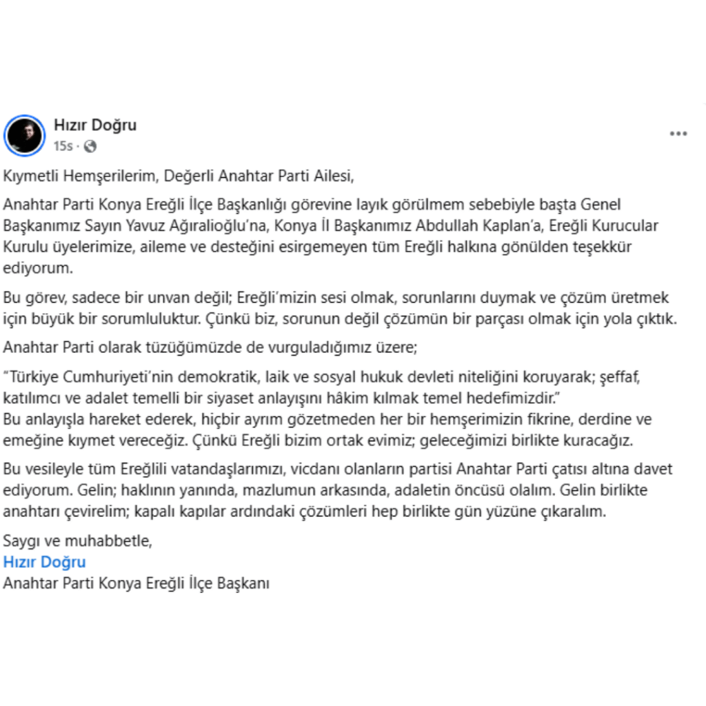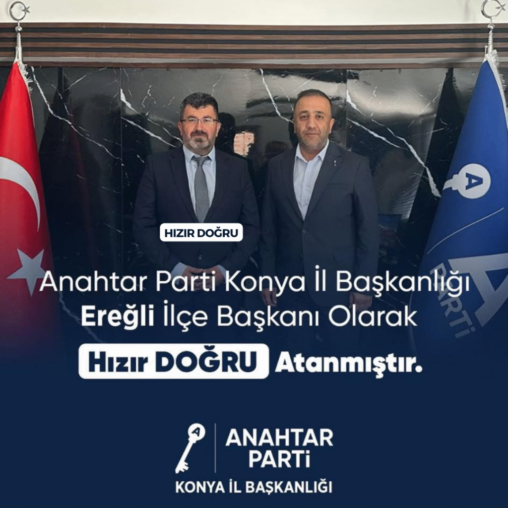Göreve atanmasının ardından açıklama yapan Doğru, kendisine bu sorumluluğu veren Anahtar Parti Genel Başkanı Yavuz Ağıralioğlu’na, Konya İl Başkanı Abdullah Kaplan’a, kurucular kurulu üyelerine ve destek veren Ereğli halkına teşekkür etti.