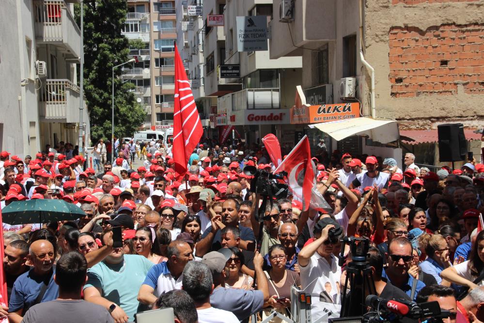 “O kooperatif denemesi ve devamında yaşananlar hepimizi üzen bir süreç. Ben İzmir Büyükşehir Belediye Başkanına ilk verdiğim talimatta, son verdiğim talimatta bu kooperatif meselesinde mağduriyetleri ortadan kaldıracak adımlar atalım ve buradaki sıkıntıdan kurtulalım. Bir talihsizlik, inşaat maliyetlerindeki fahiş artışlar, yanlışlar, hatalar, kusurlar varsa soruşturulacak kısımları ona da eyvallah. Kim bir kusur işlediyse o da hesabını verir. Ama bu ne partinin sırtına yük olmalı ne de İzmir’de Cumhuriyet Halk Partisi ile İzmirliler arasındaki samimi gönül bağını zedelememeli. Bu süreci de en yakından takip ettiğimizi bütün İzmirlilerin bilmesini istiyorum. Bu işin birileri tarafından istismar edilmesine, birileri tarafından partimiz aleyhine dönüştürülmesine hiçbir yönüyle izin vermeyeceğiz. Buradan son sözüm şu; Türkiye büyük sıkıntılarla uğraşıyor ekonomik olarak. Daha dün gece bu basiretsiz yönetim doğal gaza yüzde 25 zam yaptı. İstanbul’da yaptıkları operasyonun ekonomiye yükü 150 milyar dolar ve 6 trilyon lira. Bu para öyle bir para ki asgari ücreti iyileştirin diyoruz. Devlet desteğiyle esnafa yük olmasın diyoruz. Orada lazım olan paranın tam 120 katı İstanbul operasyonunun ekonomiye yüküdür. 120 katı asgari ücrete bir katkı yap, şu asgari ücret 22’den 30’a çıksın diyoruz ya esnafa vereceği 6 bin lira, KOBİ’ye vereceği 6 bin lira desteğin 120 katını İstanbul’da harcadılar. Her birimizin cezası cebinden 70 bin lira. Geçen 100 günde 10’ar çeyrek altın kaybetti Türkiye ekonomisi kişi başına. O yüzden bu tip işleri Erdoğan diyor ya ‘Sırf İstanbul değil başka yerler de var.’ Gizlilik olan dosyadan kimsenin haberi yok. Erdoğan’ın maşallah hepsinden var. Burada yapacağı operasyonda bu tip işlerin de ekonomiye yükünü herkes göz önüne alsın. Bir kez daha söylüyoruz. Adil yargılanma, şeffaflık, tutuksuz yargılanma ve savunma hakkının kısıtlanmadığı bir süreçte Aziz Kocaoğlu nasıl yargı önünde aklandıysa, nasıl kendini ifade ettiyse bu süreç İzmir’in bir kazanım sürecidir. Başsavcıya, sayın başsavcıya söylüyorum. İzmir’in geleneğine, kültürüne, aldığınız eğitime, bulunduğunuz makamın gereğine uygun olarak adil olun. Akın Gürlek’le yarışan, sonunda Akın Gürlek’le birlikte hesap verir. Bu kadar söylüyorum. Ben İzmir İl Başkanımızın da gözaltında olduğu bu süreçte baba evine gelmek, yöneticileri görmek, bilgi almak üzere geldim. Ama her biriniz günün bu orta saatinde, bu sıcakta, bu iş gününde koşup buraya gelmişsiniz. Hepinize teşekkür ediyorum. Bundan sonra dayanışmanızı, partiye sahip çıkan bu onurlu duruşunuzu her zaman koruyalım. Hepimiz biliyoruz ki kurtuluş yok tek başına. Ya hep beraber hepinizi çok seviyorum. Sağ olun, var olun.”