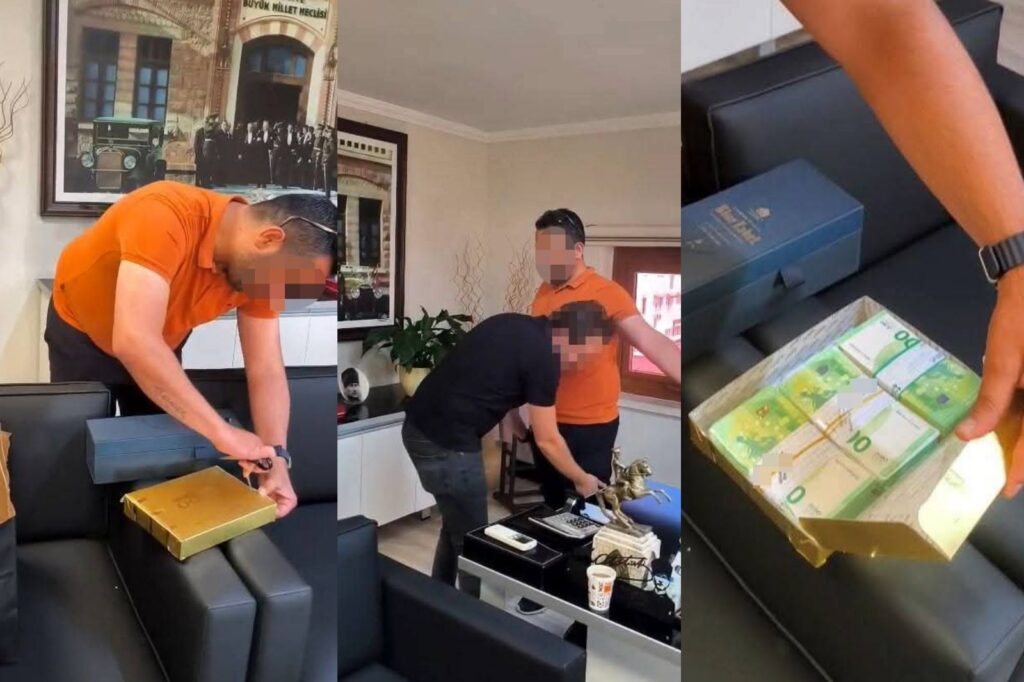 Öte yandan rüşvetle ilgili operasyon anı kameraya yansıdı. M.E.T’nin belediyedeki makam odasına giren polis, gözaltı işlemi uyguladığını belirterek, masanın yanındaki çantanın açılmasını istedi. Ardından M.E.T’nin çantada arkadaşının ikram ettiği viski ve baklava olduğunu söylemesi, açtığı baklava kutusundan ise 110 bin Euro çıktığı görüldü.