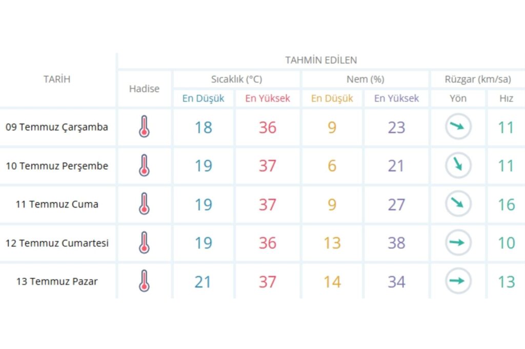 Temmuz ayının ortalarına doğru sıcaklıklar yüksek seviyelere çıkacak. 9 Temmuz Çarşamba günü 36°C ile en yüksek sıcaklık beklenirken, gece sıcaklıkları 18°C’ye kadar düşecek. 10 Temmuz Perşembe günü ise sıcaklıklar 37°C’ye kadar yükselip gece en düşük 19°C olacak. Hafta boyunca 37°C’lik sıcaklıklar devam ederken, nem oranlarının ise oldukça düşük olması bekleniyor. Cuma günü de sıcaklık 37°C, Cumartesi günü ise 36°C olarak tahmin ediliyor.