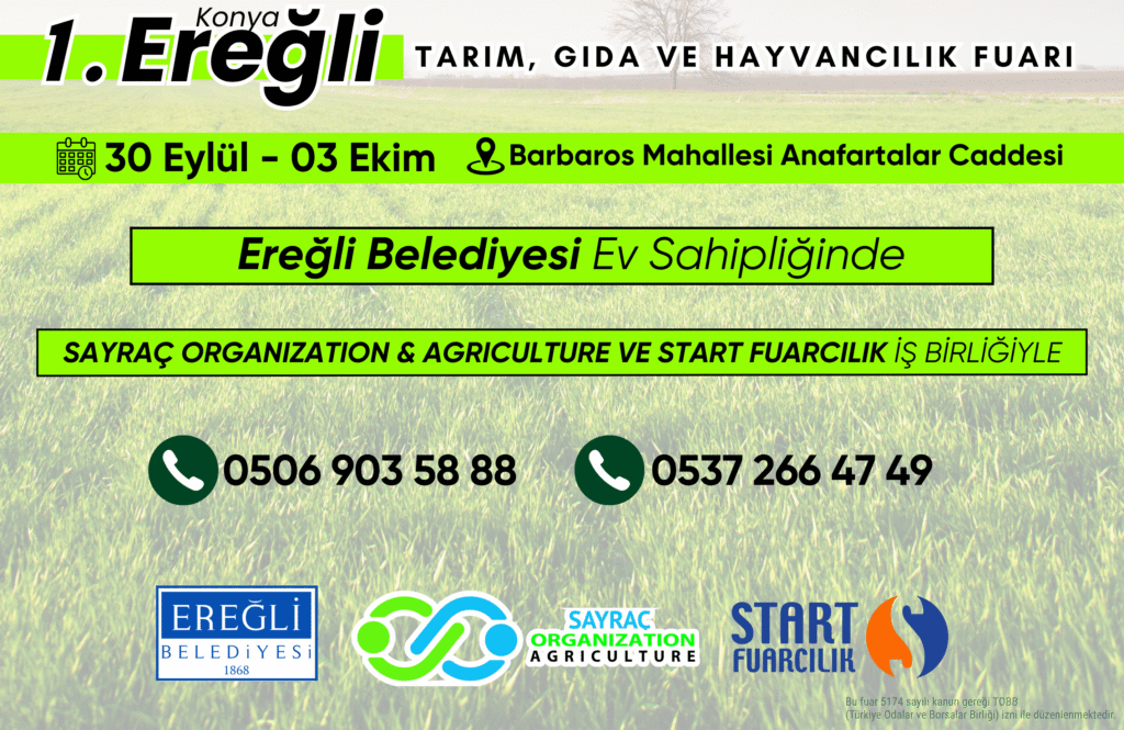 Ereğli Belediyesi ev sahipliğinde, Sayraç Tarım Organizasyon ve Start Fuarcılık iş birliğiyle bu yıl ilk kez düzenlenecek olan 1. Ereğli Tarım, Gıda ve Hayvancılık Fuarı, 30 Eylül – 3 Ekim tarihleri arasında Barbaros Mahallesi Anafartalar Caddesi Kapalı Pazar ve Açık Alan’da gerçekleştirilecek.