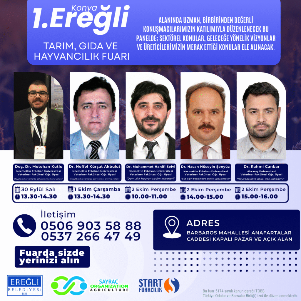 30 Eylül Salı (13.30 – 14.30): “Büyükbaş hayvanlarda döl verimini artırma yolları” – Doç. Dr. Metehan Kutlu – Necmettin Erbakan Üniversitesi Veteriner Fakültesi Öğretim Üyesi