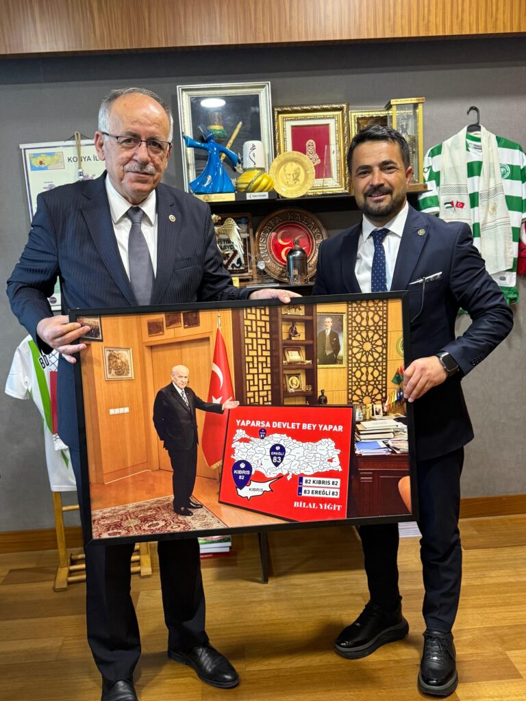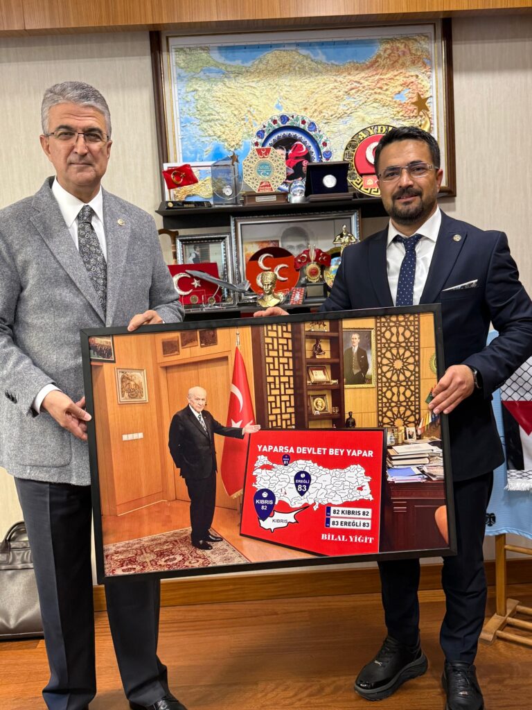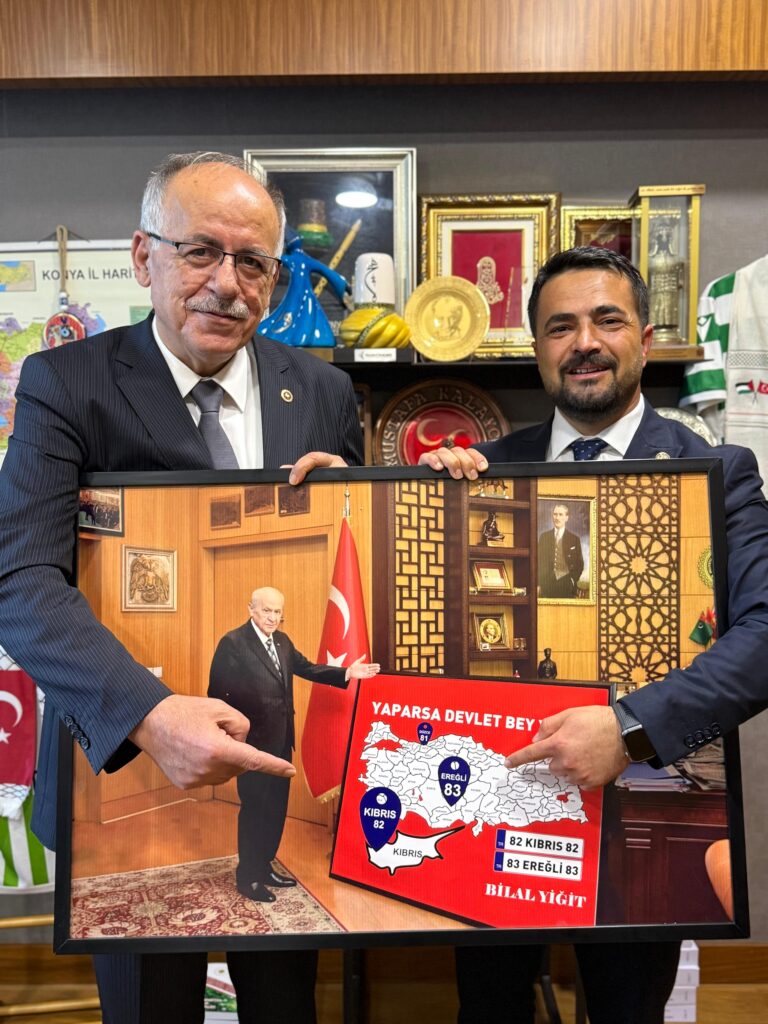 Yiğit, ziyaretin sonunda Kalaycı ve Aydın’a özel anlam taşıyan bir tablo hediye etti. Tabloda, MHP Genel Başkanı Devlet Bahçeli’nin ‘Kıbrıs’a 82 plaka’ önerisinden ilham alınarak Kıbrıs 82 plaka, Ereğli ise 83 plaka olarak yer aldı.