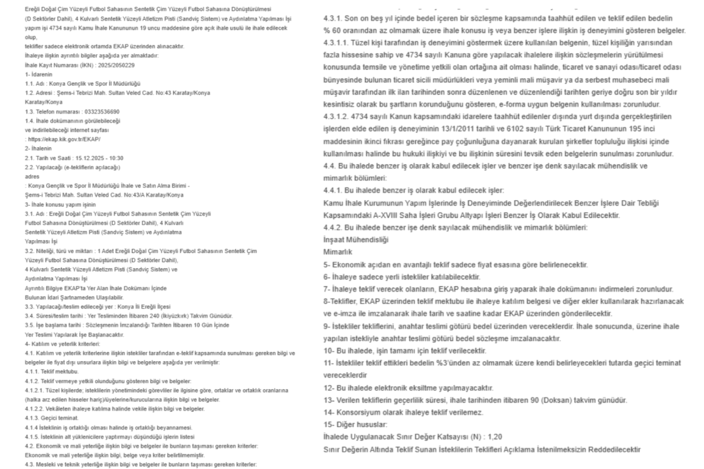 Ereğli’de spor altyapısını güçlendirecek önemli bir proje için ihale süreci başlatıldı. Konya Gençlik ve Spor İl Müdürlüğü tarafından yayımlanan ihale ilanına göre, Ereğli Atatürk Stadyumu mevcut doğal çim yüzeyli futbol sahası tamamen yenilenerek sentetik çim yüzeyli modern bir sahaya dönüştürülecek.