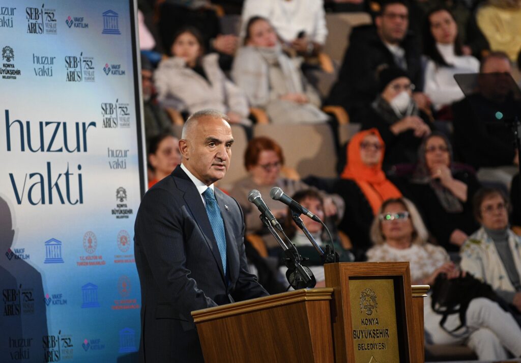 Mevlana’nın bugün insanlığa ışık olan kıymetli sözlerini “edebi kaygı” ile kaleme almış bir şair veya yazar olmadığını vurgulayan Bakan Ersoy, “Allah aşkından, Peygamber sevgisinden beslenen, kaynağı Kur’an yolu İslam olan bir tasavvuf ehlidir. Nitekim bizlere adeta bir vasiyet gibi bıraktığı kıymetli sözünde, kendisini ‘Kur’an-ı Kerim’in bendesi ve Peygamber Efendimiz’in nurlu ayağının tozu’ olarak niteler. ‘Kur’an-ı Kerim hakikatleri ile bağdaşmayacak hiçbir sözü olamayacağını’ yineler. Üstelik, ‘bunun dışında kendisinden bir şey nakletmeye çalışandan da şikayetçi ve davacı olduğu’ uyarısını yapar” diye konuştu.