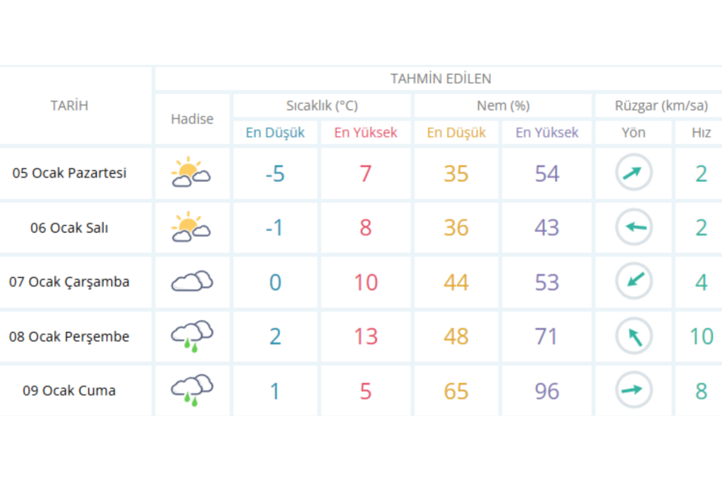 6 Ocak Salı günü parçalı bulutlu hava devam edecek. En düşük sıcaklık -1, en yüksek sıcaklık ise 8 derece olarak tahmin ediliyor.