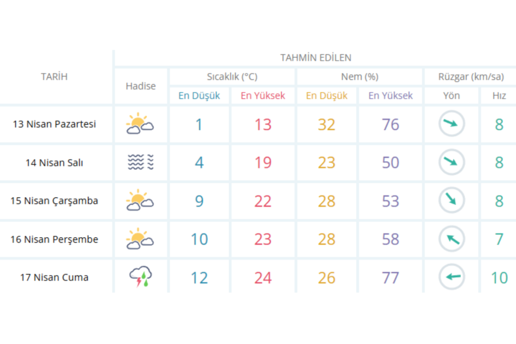 Sıcaklık artışıyla birlikte hafta kapanışında hava durumu değişikliğe uğrayacak. 17 Nisan Cuma günü sıcaklığın 24 dereceye kadar çıkması tahmin edilse de, gökyüzünün yer yer gök gürültülü sağanak yağışlı olması bekleniyor. Yağışla birlikte rüzgar hızının da saatte 10 kilometreye ulaşacağı öngörülüyor.