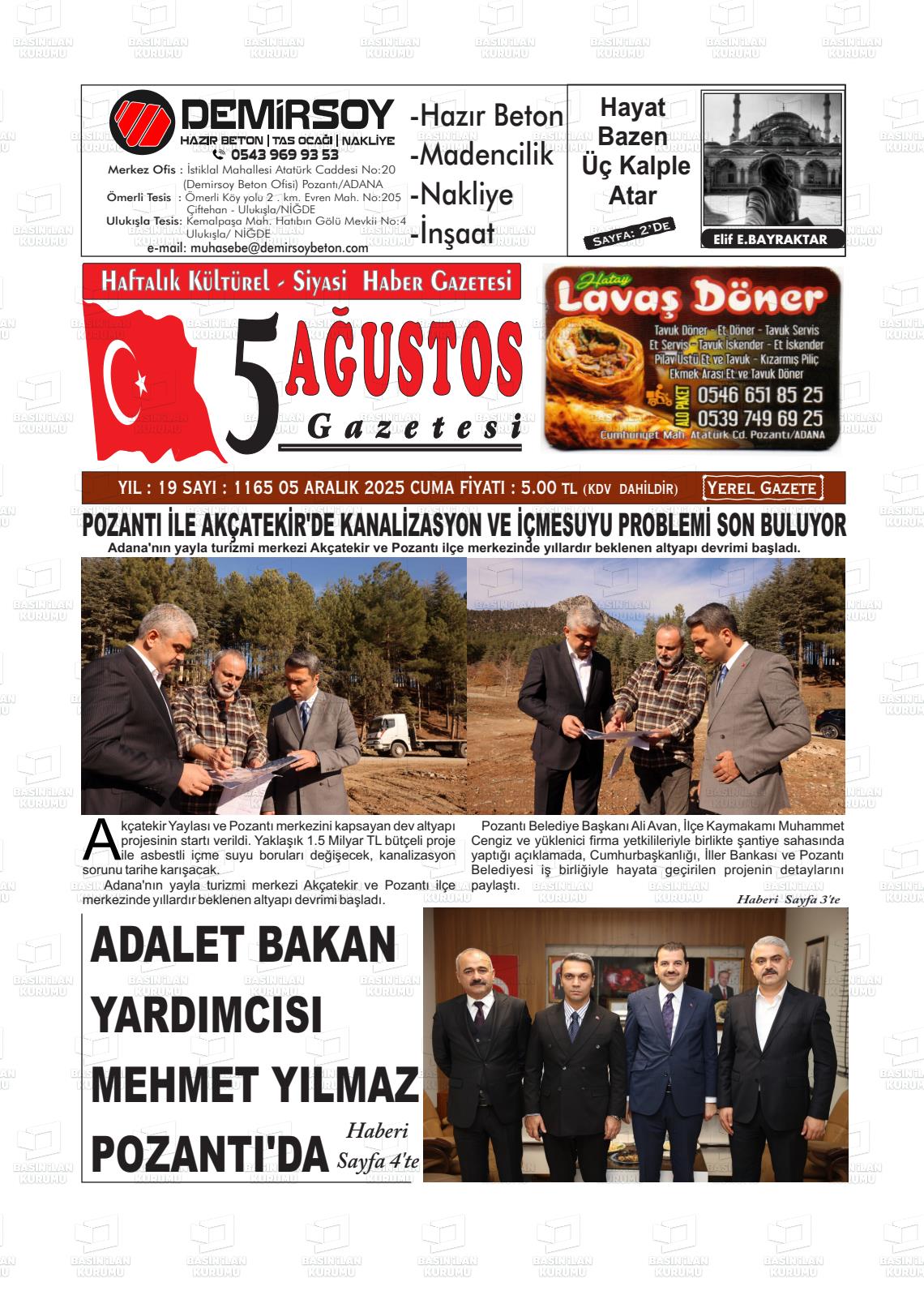 Adana Yerel Gazeteleri 05 Aralık 2025, Cuma Günü Manşeti
