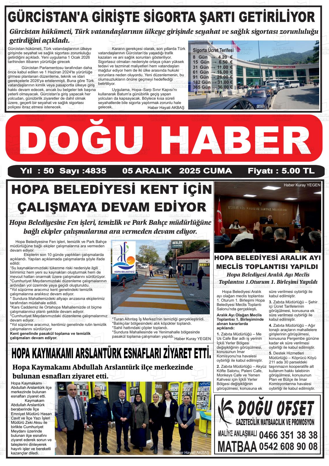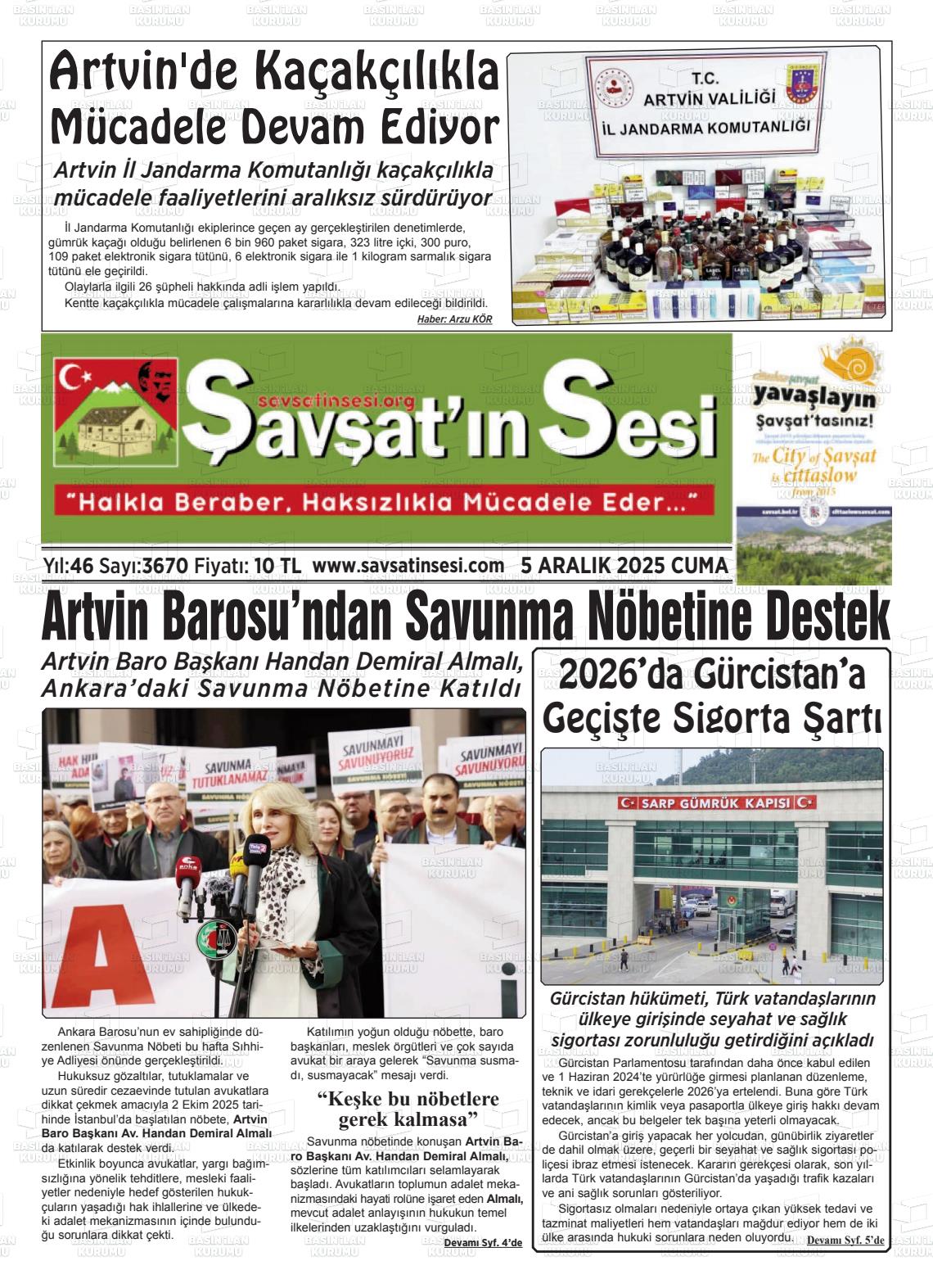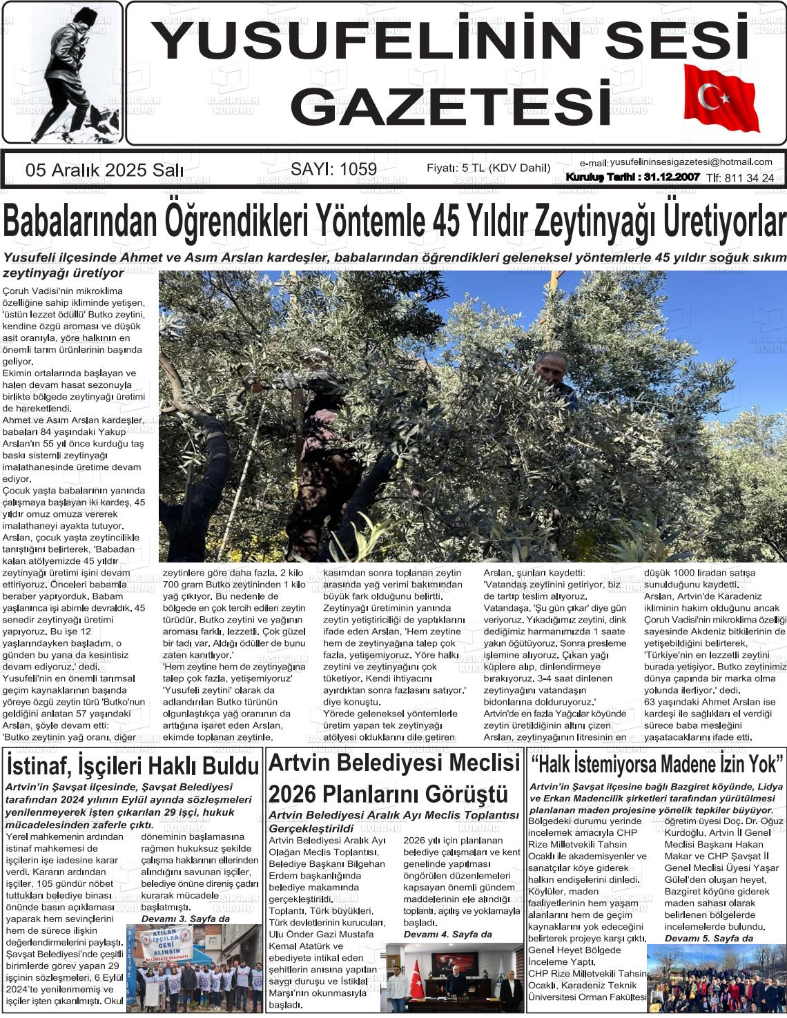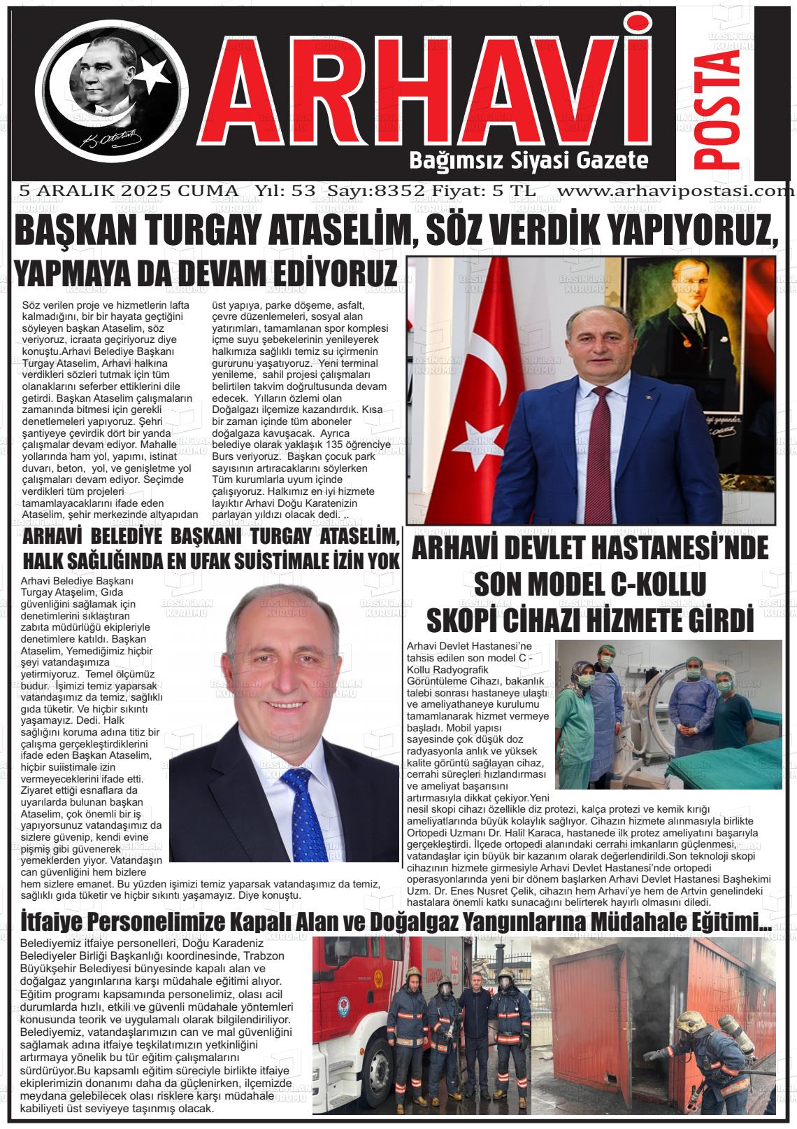 Artvİn Yerel Gazeteleri 05 Aralık 2025, Cuma Günü Manşeti