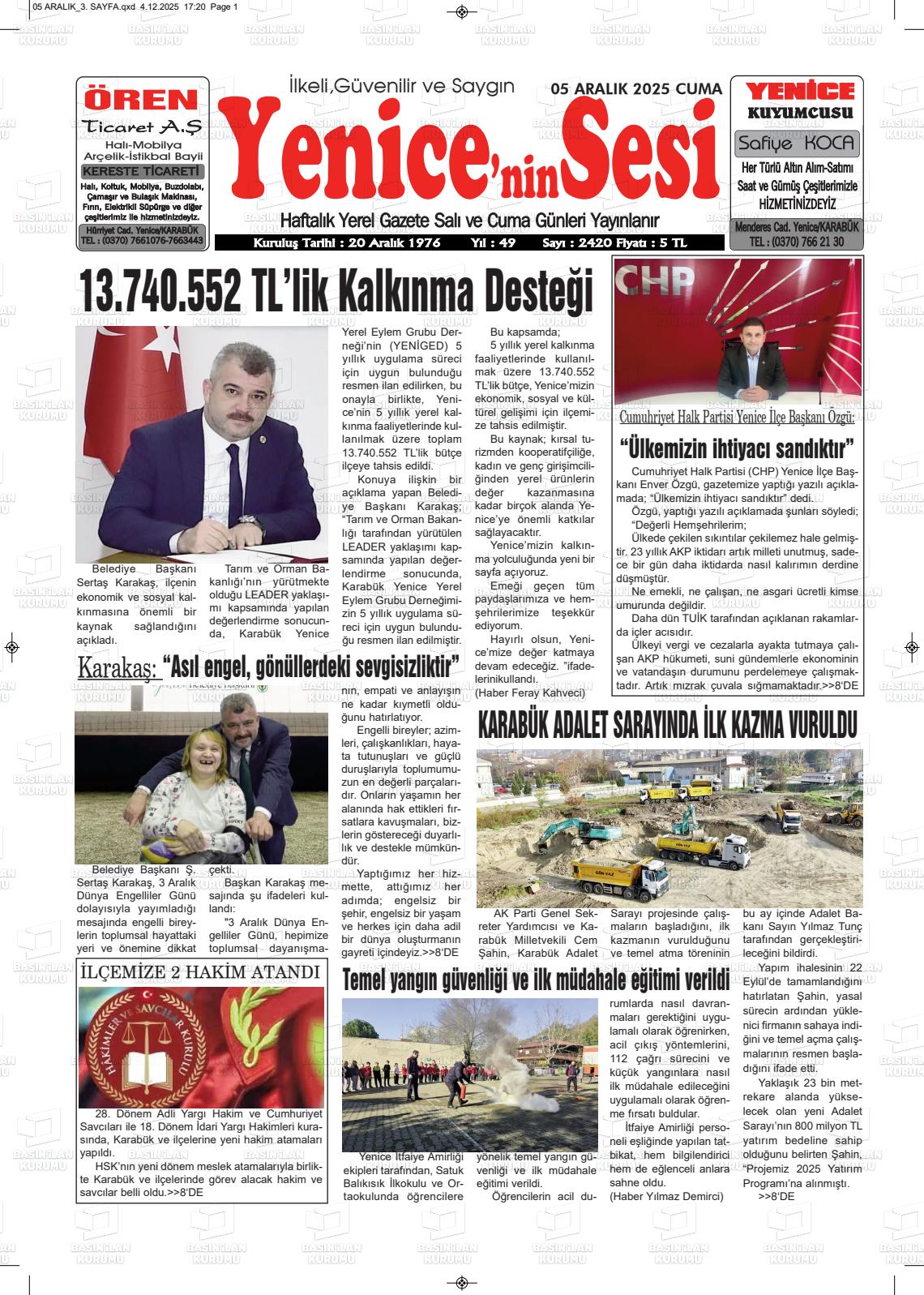 Karabük Yerel Gazeteleri 05 Aralık 2025, Cuma Günü Manşeti