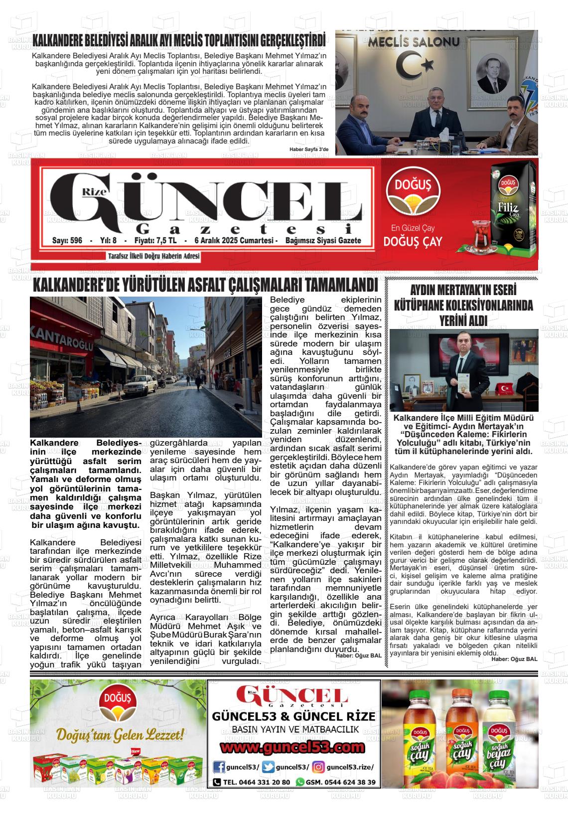 Rİze Yerel Gazeteleri 06 Aralık 2025, Cumartesi Günü Manşeti