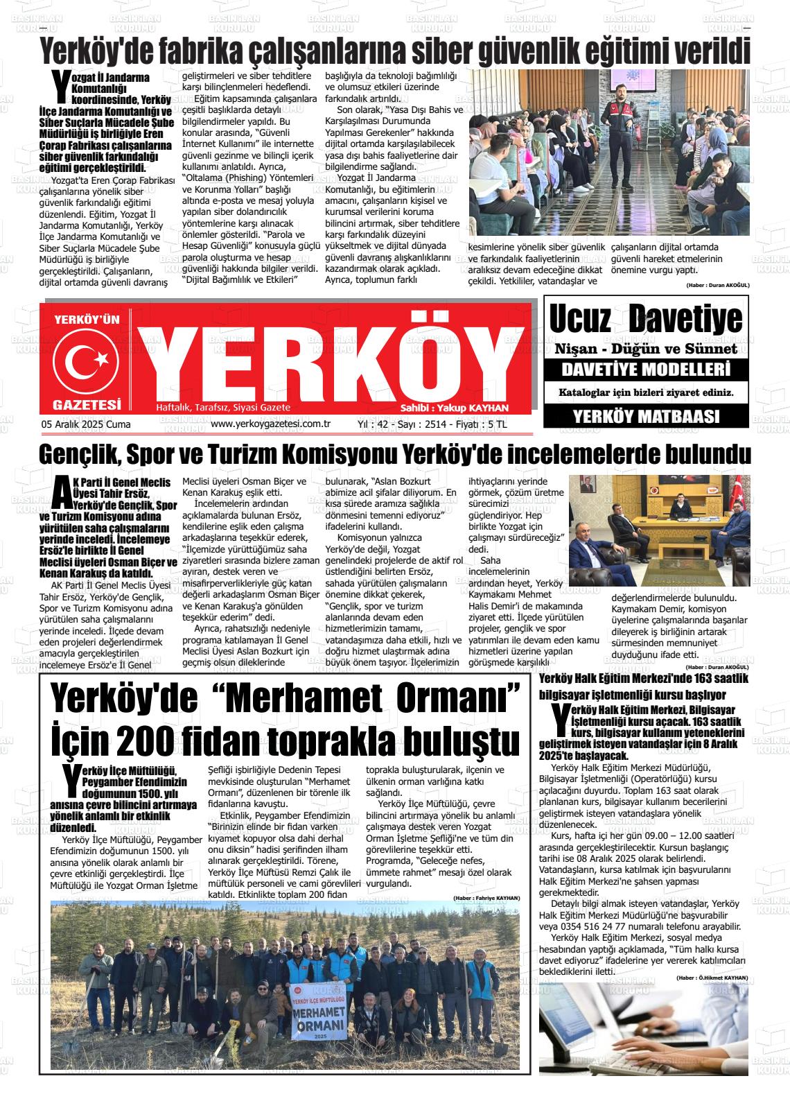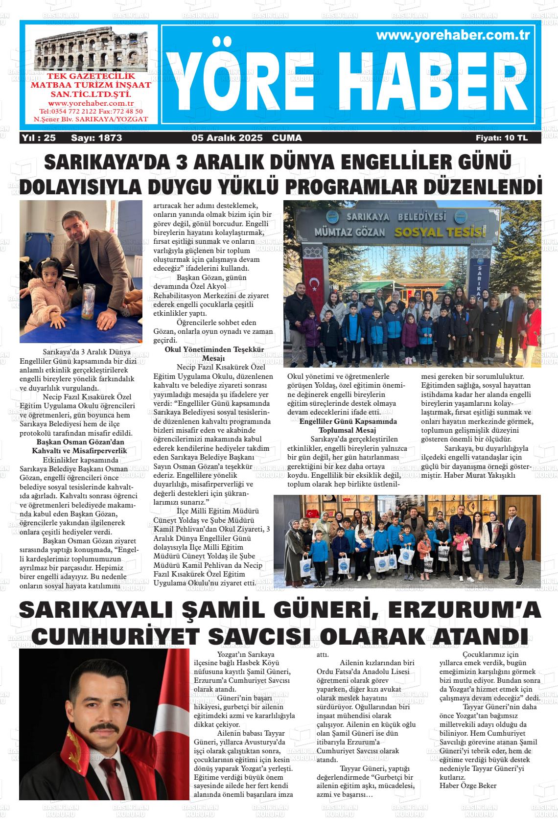 Yozgat Yerel Gazeteleri 05 Aralık 2025, Cuma Günü Manşeti