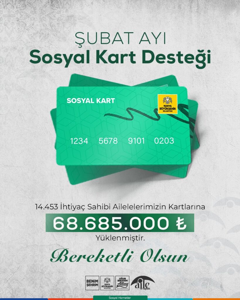 Konya Büyükşehir Belediyesi, Şubat ayına ilişkin Sosyal Kart desteklerini ihtiyaç sahibi ailelerin hesaplarına yatırdı. Toplam 14 bin 453 aileye 68 milyon 685 bin lira destek sağlandı.