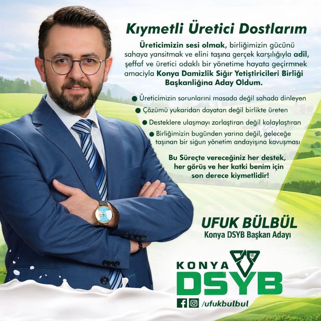 Konya Damızlık Sığır Yetiştiricileri Birliği (DSYB) Başkanlığına Ufuk Bülbül aday olduğunu açıkladı. Bülbül, üreticinin taleplerini merkeze alan, şeffaf ve adil bir yönetim anlayışıyla birliği daha güçlü bir yapıya kavuşturmayı hedeflediklerini söyledi.